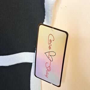 Thus is a stunning black and White Romper by Coco and Shay. It is halter style with gold decorative buttons and a keyhole back Fasten. The viscose/poly blend feels like a sweater and has plenty of stretch (ptp stretch to 21"). The white bands down the sides and the white "belt" on the waist are form flattering.