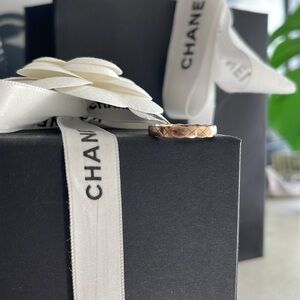This is Chanel’s newer designs. The ring comes in beige gold, which is only sold by Chanel. The bag and box are in perfect condition. Chanel did the inscription within that says “gold reflect gold”. this will not lose its value. It’s an amazing piece. Size 7