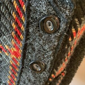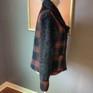 Classic plaid sweater jacket in dark gray and red. Very nice. Size S/M.