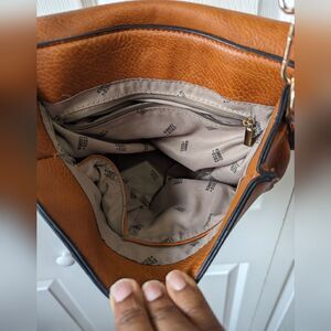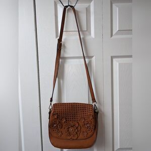 Coco + Carmen brown leather crossbody purse. Floral print front details. Magnetic closure. Inside zipper pocket and back zipper pocket. Good condition. Please see all the pictures.