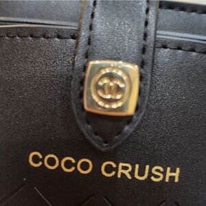 Elegant black leather phone case with a gold chain. Features a stylish Coco Crush design. Large enough for cell phone (see dimensions) with a small interior pocket. Long silver and leather crossbody chain makes it easy to wrap around shoulders. Versatile, could be used for credit cards, lipstick, keys, and other small items.