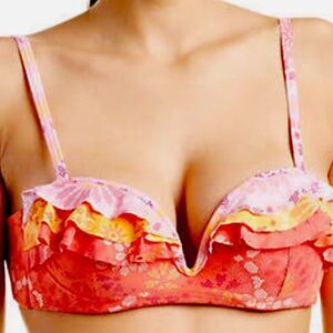Stylish floral bra with playful ruffles. Features vibrant pink and orange colors. Perfect for a chic look.
