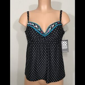 Black and white Polka dot tankini top. Very pretty aqua blue border print. Soft formed cups underwire and adjustable straps. Ties in the back for easy adjustment.