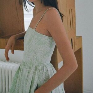 This maxi dress by Coco Shop will truly appeal to your inner feminine self. With a breadfruit print in sage green; the dress is a true summer delight. Made from soft, structured cotton, this dress is sleeveless with a long gathered skirt that hits the ankle. It zips up the back with an invisible zipper. Straight neckline. Skinny strap Nicole poof dress. Size medium.