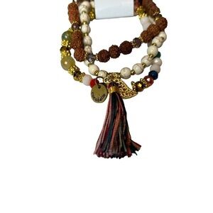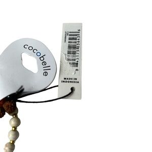 This NWT Cocobelle beaded three strand bracelet has wood look beads, marbled look beads and multicolored crystal look beads with goldtone separators and two goldtone charms ( one is a leaf and the other a round charm with the Cocobelle name on it. ) To finish this stunning bracelet is a multi colored tassel! Cocobelle has such quality jewelry and this stretch bracelet trio is a beautiful example of the quality of this Indonesian made piece. Such a great gift for someone special or for yourself!!! 😊