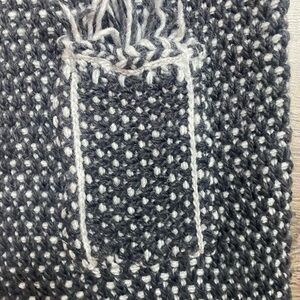 Beautiful fringe detail. It is a dark gray color(almost black) and white sweater