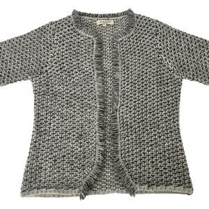 Classic grey knit sweater blazer made in Italy by Cocogiò women’s size Small. Excellent preowned condition with no flaws of note. Open fringe front. Acrylic / Nylon / Mohair / Wool blend.
