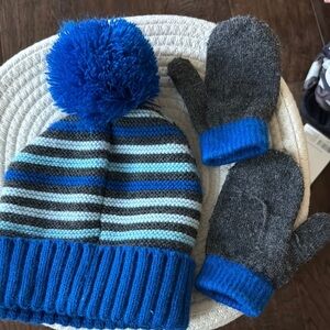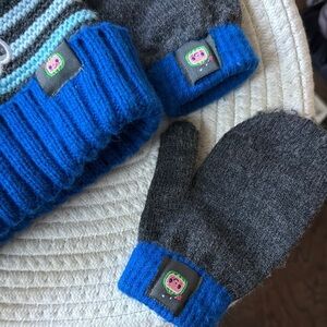 Keep your child warm and stylish with this blue striped hat and gloves set. Featuring playful designs, it's perfect for any outdoor adventure. Preloved. Hat with mittens. Size 2T-5T.