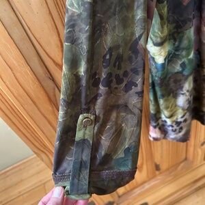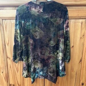 Women's Cocomo blouse, dark floral, 3/4 button up, 3/4 sleeve with Botton closure, front pleats, size large