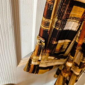 Chic geometric design. Black and gold hues. Perfect for versatile styling. Polyester spandex material is stretchy. 3/4 roll tab sleeves. 2 pockets. 1X. Measures 23 inches armpit to armpit and 29 inches down the back. NWT. All items are from a smoke free home.
