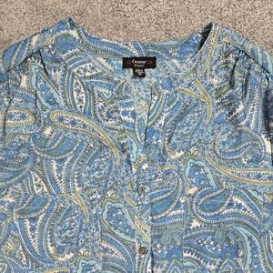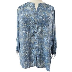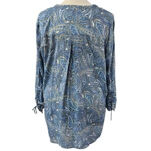 Cocomo Woman Blue Paisley Split Neck Button-Up Tunic Tie Cuffs Boho Office
