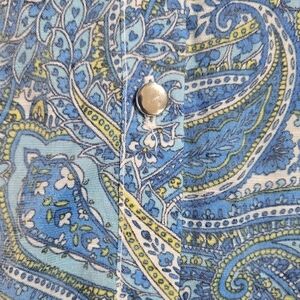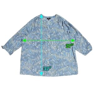 Good used condition, with no stains or tears. A blue paisley button-up tunic with a silky-like feel. Has a split neck, chest pockets, side vents, and 3/4 sleeves with ties at the cuffs.