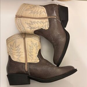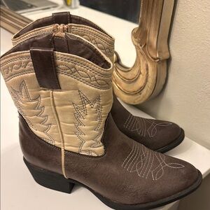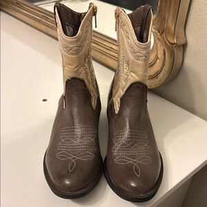 Stylish Western boots with intricate stitching. Features a rich brown base and cream upper. Perfect for casual or dressy occasions.