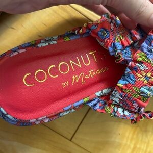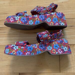 Coconuts by Matisse Platform Casual Sandals Mid Heel 2-3" Womens Size 7 Floral flower power retro vibes. Shoes are new without box. Reddish background with bright floral print. The Life of a Showgirl. Gives 70s and 80s vibes. Smoke free home.