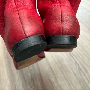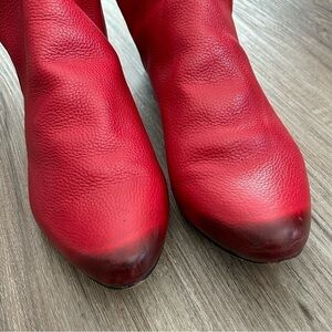 Striking red ankle booties. Smooth leather finish. Ideal for a chic ensemble.