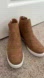 Stylish and comfortable slip-on sneaker booties in a warm camel/brown faux suede. Features a sleek ankle-height silhouette with elastic side panels for easy on and off, plus a cushioned white rubber sole for all-day comfort. The perfect blend of casual sneaker comfort with a polished bootie look.