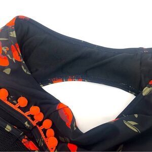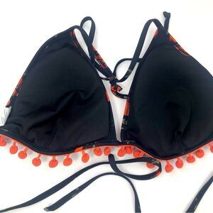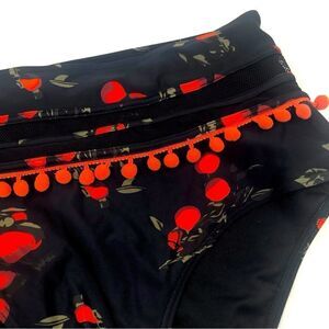 Cocoship Black Red Floral PomPom Trim High Waisted String Bikini