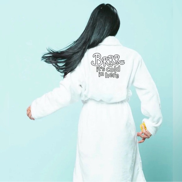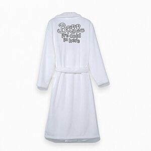 Cozy white robe featuring playful text on the back. Perfect for lounging.