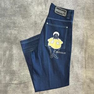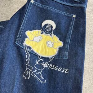 Style Tags: y2k, hip hop fashion, cartoon jeans, embroidered denim, novelty pants, streetwear, chubbiggie, 2000s style, baggy jeans, rare find, urban fashion