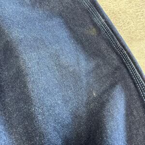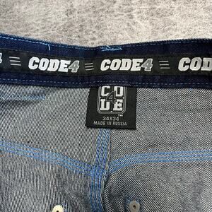 -Rare Code4 denim jeans featuring a bold embroidered graphic of "Chubbiggie" on the back pocket. Deep blue wash with fun cartoon hip-hop flair. A playful throwback to 2000s novelty streetwear