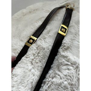 This beautiful brown leather belt from Code Azure is a must-have accessory for any fashion-forward individual. Made in Italy and adorned with a brass buckle and 2 metal medallions this adjustable belt is perfect for both men and women. The belt is pre-owned and has a vintage look, adding to its charm and appeal.