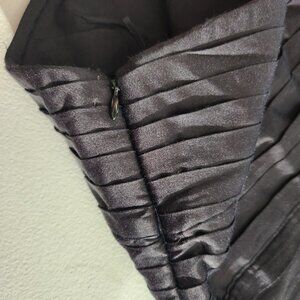 Asymmetrical, one-shoulder design with pleated horizontal banding throughout