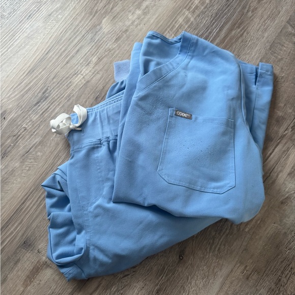 These blue denim scrubs offer a relaxed fit, perfect for a laid-back style. The soft, worn fabric provides comfort and a classic soft texture.