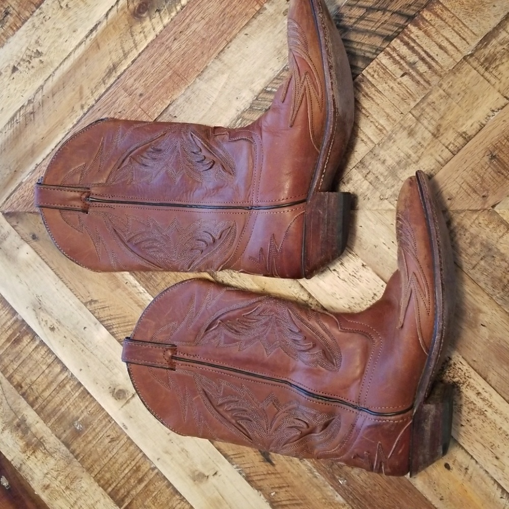 Cognac leather embroidered boots. Considerable wear, fully broken in. Priced accordingly.