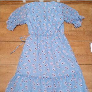 Pretty cornflower blue ruffle dress with pink flower pattern. Faux wrap design. Ruffled hem. Chiffon-like overlay. Very cutesy and feminine! Code x Mode brand. Women's size small. In excellent condition with no imperfections! #Resortwear #Easter #Garden #pastel #vacation #church #spring