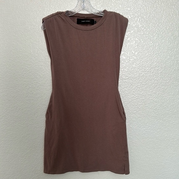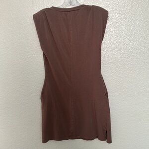Crafted in a muted, earthy brown tone, the dress features subtle shoulder pads that add a touch of structure to the otherwise relaxed fit.