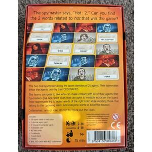 Includes: 16 agent cards in two colors, 1 double agent card, 7 innocent bystander cards, 1 assassin card, 40 key cards, 1 rulebook, 1 card stand, 1 timer, and 200 cards with 400 codenames.