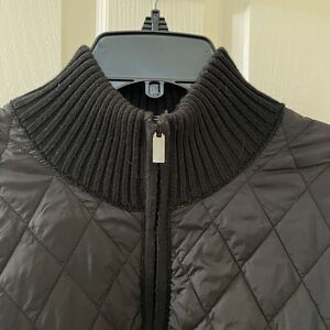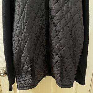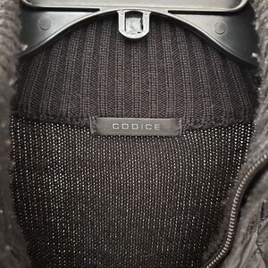 Codice Black Quilted Sweater Jacket Full Zip Men's Size 56. The front of the jacket is quilted material and the sleeves and back are sweater material. I am unsure of the material make-up, as I cannot find a tag inside of the jacket that indicates such. Full zip and two front pockets. Has been worn and washed and there is some pilling to the sweater material, but no other issues that I can find. Good Used Condition.