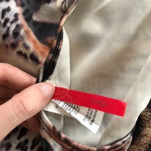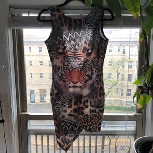 Fun, tacky little Y2K mini w/ asymmetrical hem. 30" shoulder to shortest hem, 36" to longest. EUC, no flaws that I could find. Measurements in photo, super stretchy.