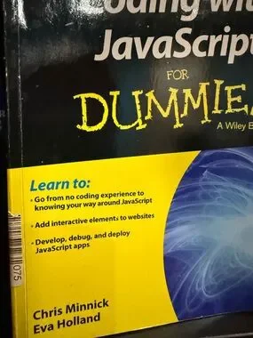 Coding with JavaScript For Dummies by Wiley. Bright yellow and black cover design. Clear, beginner-focused guide to learning JavaScript fundamentals and building simple, practical web interactions. Includes step-by-step examples and hands-on exercises for new coders.