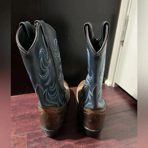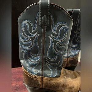 Cody James Brown/Blue Leather Round Toe Pull On Western Boots Boys Size 4D EUC. Style #41477Y. Excellent condition except for scuffs on toes. See pic