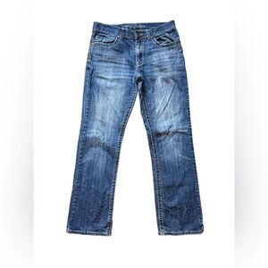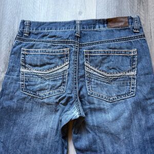 Cody James men’s jeans. Comfy, classic. Stitched designs on back pockets. Factory distressing and whiskering. Material: 100% cotton. Please see photo section for approximate flat measurements + close up signs of wear from use.