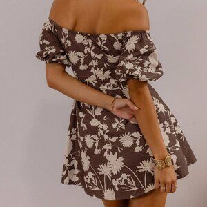 Coffee Brown Boho Women's Floral Off Shoulder Mini Vacation Dress