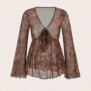 Coffee Brown Boho Women's Vacation Paisley Print Tie Front Ruffle Hem Shirt top