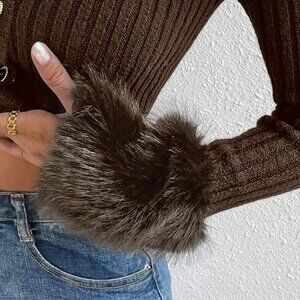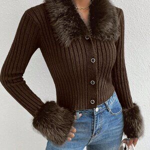 Coffee Brown Casual Women's Borg Collar Fuzzy Cuff Cardigan