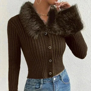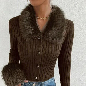 Coffee Brown Casual Women's Borg Collar Fuzzy Cuff Cardigan