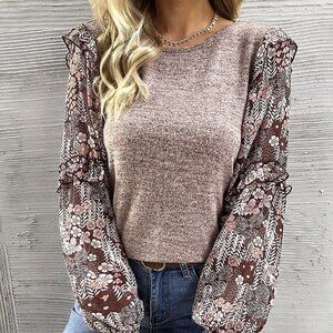 Coffee Brown Casual Women's Crew Neck Floral Blouse