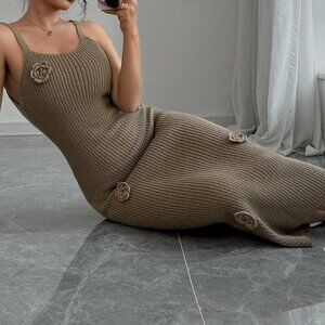 Coffee Brown Casual Women's Floral Camisole Sweater Dress And Cardigan Set