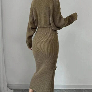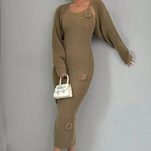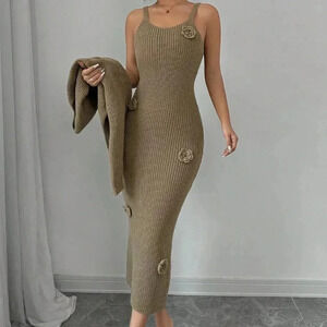 Coffee Brown Casual Women's Floral Camisole Sweater Dress And Cardigan Set
