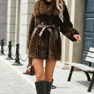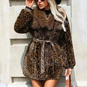 Coffee Brown Casual Women's Long Sleeve Fluffy Leopard Print Button Coat