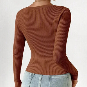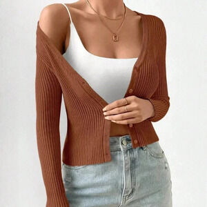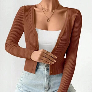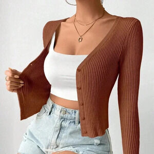 Coffee Brown Casual Women's Slim Fit V-Neck Long Sleeve Short Cardigan
