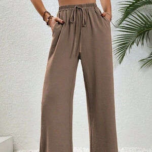 Coffee Brown Casual Women's Summer Drawstring Elastic Waist Wide Leg Pants