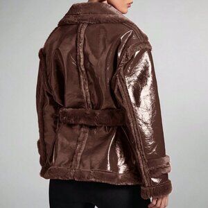 Coffee Brown Casual Women's faux fur detailed Long Sleeve faux Leather Jacket