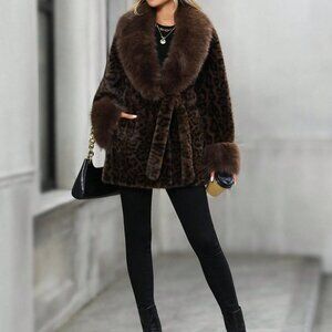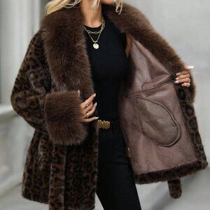 Coffee Brown Chic Women's Leopard Print Lapel Long Sleeve Faux Fur Jacket coat