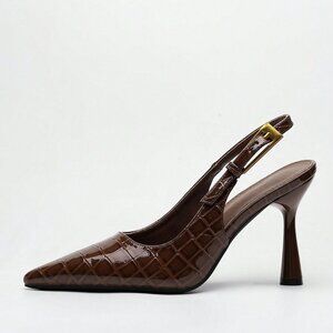 Coffee Brown Elegant Women's Pointed Toe Buckle Embellished Patent Leather Sling