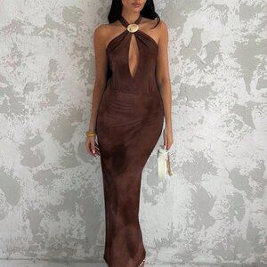Coffee Brown Sexy Women's Sleeveless Shell Decor Backless maxi Dress